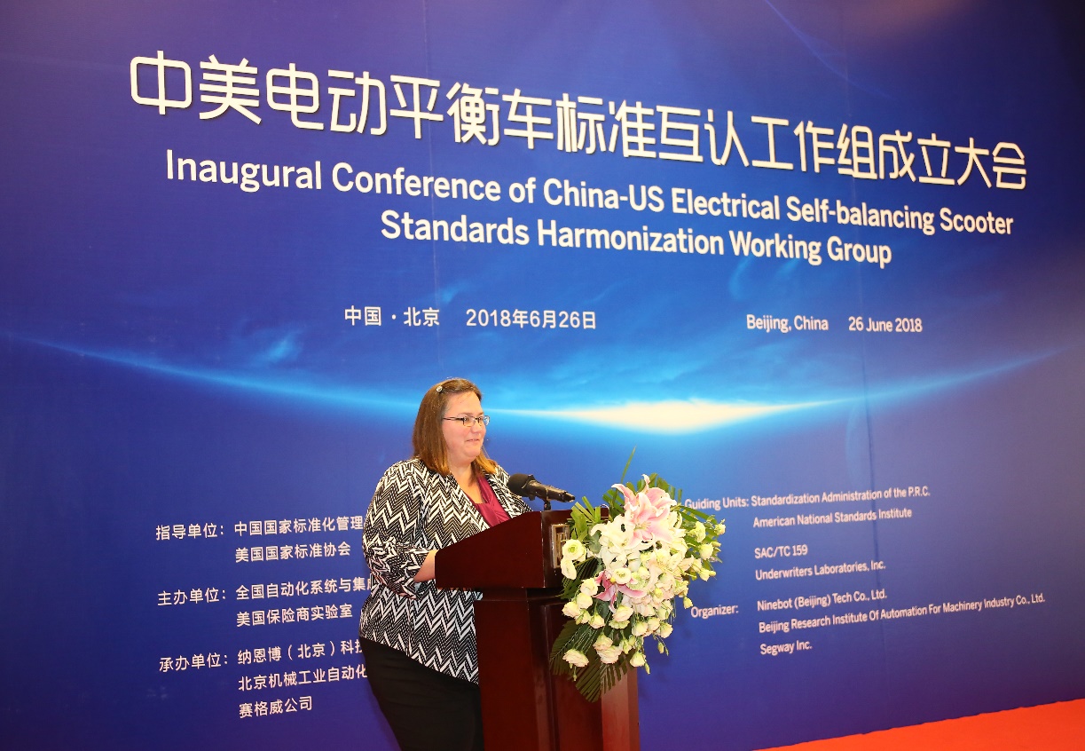 626日,中美电动平衡车标准互认工作组成立大会在北京唯实大厦成功举行。全国自动化系统与集成标准化技术委员会主任委员、机械总院集团董事长王德成与美国保险商实验室全球副总裁 Philip M.Piqueira分别代表中美双方签署电动平衡车标准互认合作协议。中国国家标准化管理委员会副主任殷明汉、IEC美国国家委员会副主席Sonya Bird、美国大使馆参赞Cynthia Griffin、北京航空航天大学教授王田苗、全国自动化系统与集成标准化技术委员会秘书长黎晓东、Segway-Ninebot公司总裁王野等领导及电动平衡车国家标准起草组专家出席会议,共同见证了中美两国标准化合作的历史时刻。