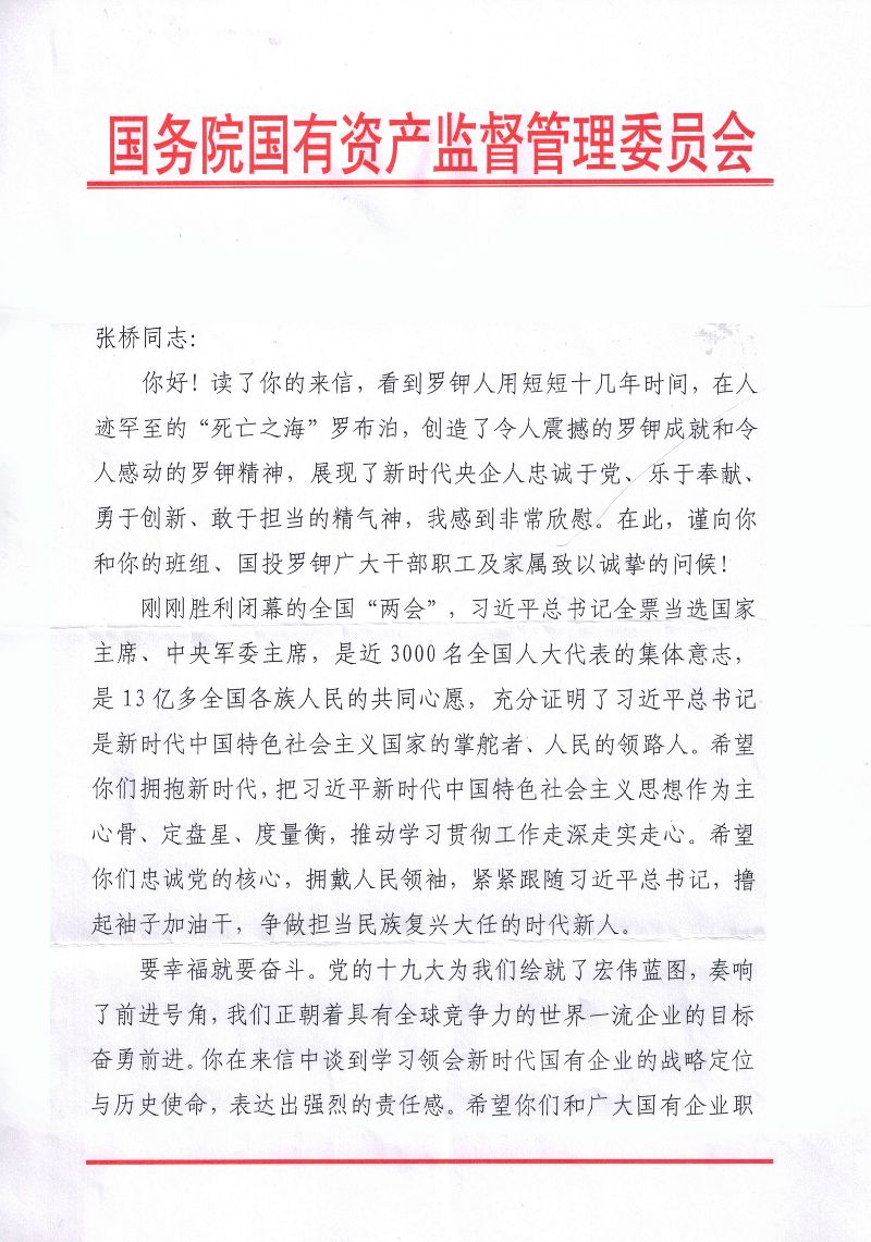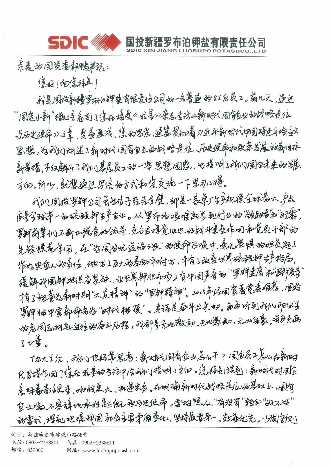 我是国投新疆罗布泊钾盐有限责任公司的一名普通的85后员工。前几天,通过“国资小新微信看到了您在接受《求是》杂志专访的《新时代国有企业的战略定位与历史使命》文章,受益匪浅。您的思考,通篇贯彻着习近平新时代中国特色社会主义思想,为我们讲述了新时代国有企业的战略定位、历史使命和改革发展的新目标新举措,不仅解开了我们基层员工的一些思想困惑,也指明了我们国企未来的发展方向。所以,就想通过写信的方式和您交流一下学习心得。