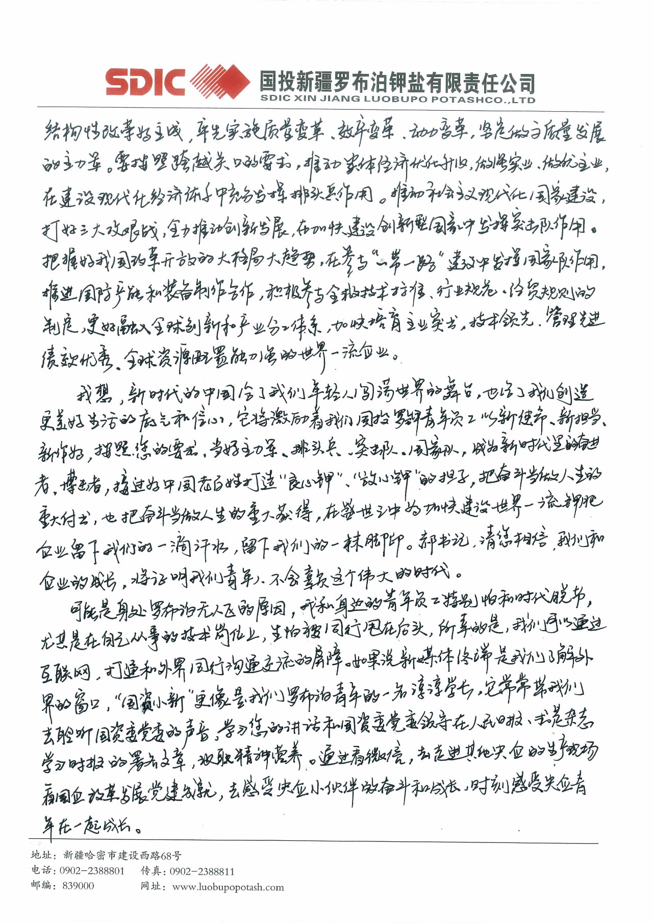 这封写给郝鹏书记的信,来自国投新疆罗布泊钾盐有限责任公司硫酸钾厂加工车间加工三班的一位普通青年员工。